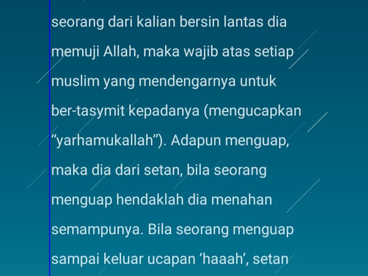 Rasulullah Shallallahu ’alaihi wasallam bersabda: إِنَّ اللَّهَ يُحِبُّ الْعُطَاسَ وَيَكْرَهُ التَّثَاؤُبَ فَإِذَا عَطَسَ فَحَمِدَ اللَّهَ فَحَقٌّ عَلَى كُلِّ مُسْلِمٍ سَمِعَهُ أَنْ يُشَمِّتَهُ وَأَمَّا التَّثَاؤُبُ فَإِنَّمَا هُوَ مِنْ الشَّيْطَانِ فَلْيَرُدَّهُ مَا اسْتَطَاعَ فَإِذَا قَالَ هَا ضَحِكَ مِنْهُ الشَّيْطَانُ “Sesungguhnya Allah menyukai bersin dan membenci menguap. Oleh …