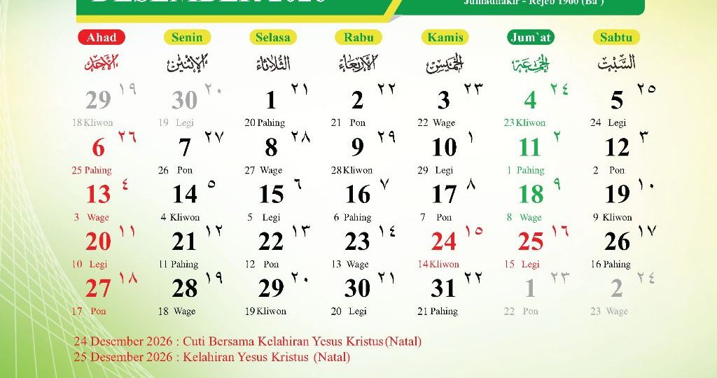 Desember 2026 (Jumadilakhir – Rajab 1448 Hijriah)