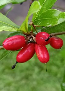 - Buah berwarna merah tua dengan panjang 2 cm dan pulp berwarna merah muda-keputihan, memiliki satu biji yang keras dan testa yang mengkilap.