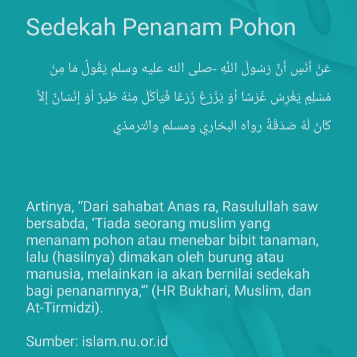 Artinya, “Dari sahabat Anas ra, Rasulullah saw bersabda, ‘Tiada seorang muslim yang menanam pohon atau menebar bibit tanaman, lalu (hasilnya) dimakan oleh burung atau manusia, melainkan ia akan bernilai sedekah bagi penanamnya,’” (HR Bukhari, Muslim, dan At-Tirmidzi).