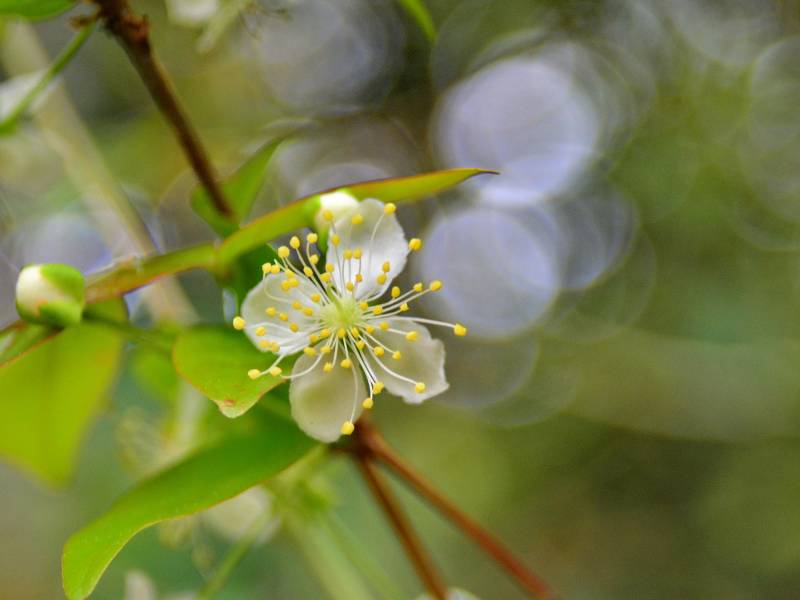 • Bunganya wangi, terletak di ketiak daun dengan jumlah 1-4 bunga. Bunga tanaman dewandaru berwarna krem keputihan atau kuning susu berukutan kecil-kecil dengan diameter 1 cm. Kelopak bunganya berbentuk tabung dengan 4 lekukan dan 8 rusuk. Mahkota bunga berwarna putih dengan panjang 7-11 mm.