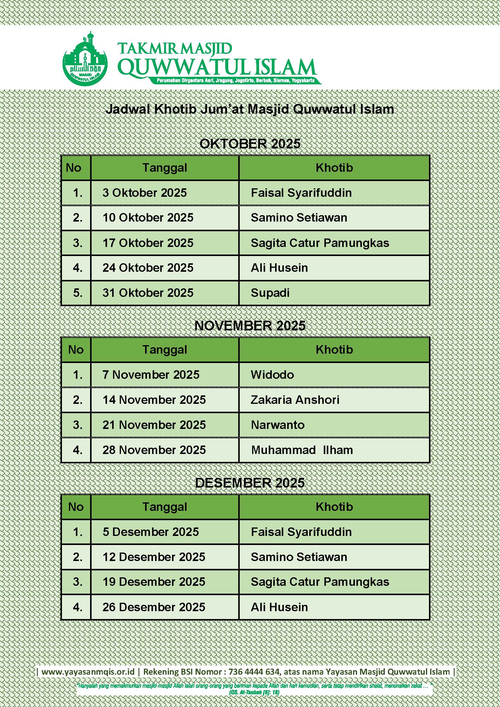 Berikut ini jadwal khotib untuk pelaksanaan kotbah Jumat dari Oktober 2025 sampai Desember 2025.