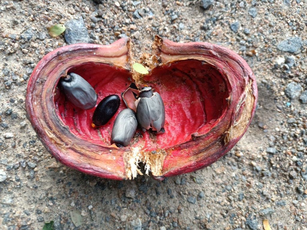 - Buah berupa bumbung besar, lonjong gemuk, 7,6–9 x 5 cm, berkulit tebal, merah terang, akhirnya mengayu, berkumpul dalam karangan berbentuk bintang.