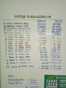 - Hasil penerimaan infaq selama bulan ramadhan terkumpul ; Rp. 2.126.000,- (dua juta seratur dua puluh enam ribu rupiah)
