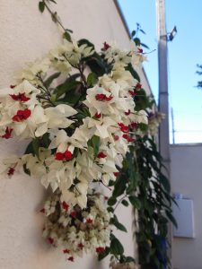 - Bunga majemuk tandan, keluar dari ujung ranting atau ketiak daun. Kelopak putih, berbulu, panjang 1-3 cm, mahkota merah, panjang lebih kurang 2 cm.