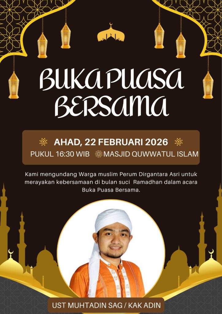Menyambut bulan suci ramadhan 1447 Hijriyah ini, takmir masjid Quwwatul Islam menyelenggarakan pengajian jelang buka bersama. Pada kesempatan Ahad 22 Februari 2026 ini, pengajian akan diisi oleh Ustadz Muhtadin S.Ag (Kak Adin).