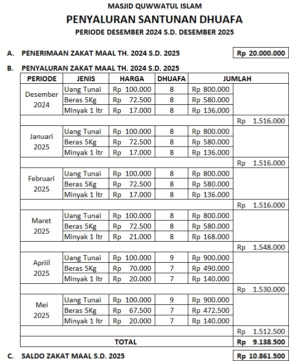 Berikut ini laporan penyaluran Zakat sampai dengan Akhir Desember 2025 seperti yang dilaporkan ketua UPZ Masjid Quwwatul Islam Bapak Farid Pangaribuan ;