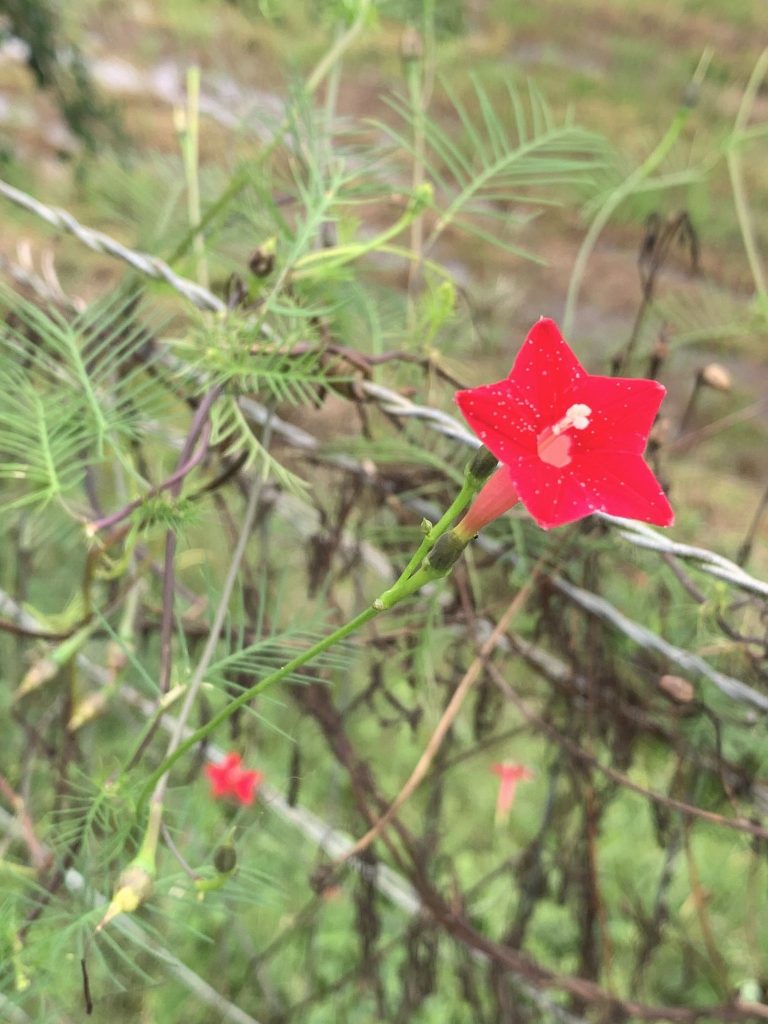 - Bunga keluar dari ketiak daun dengan tangkai panjang, berwarna merah cerah, berbentuk tabung dengan ujung bintang.