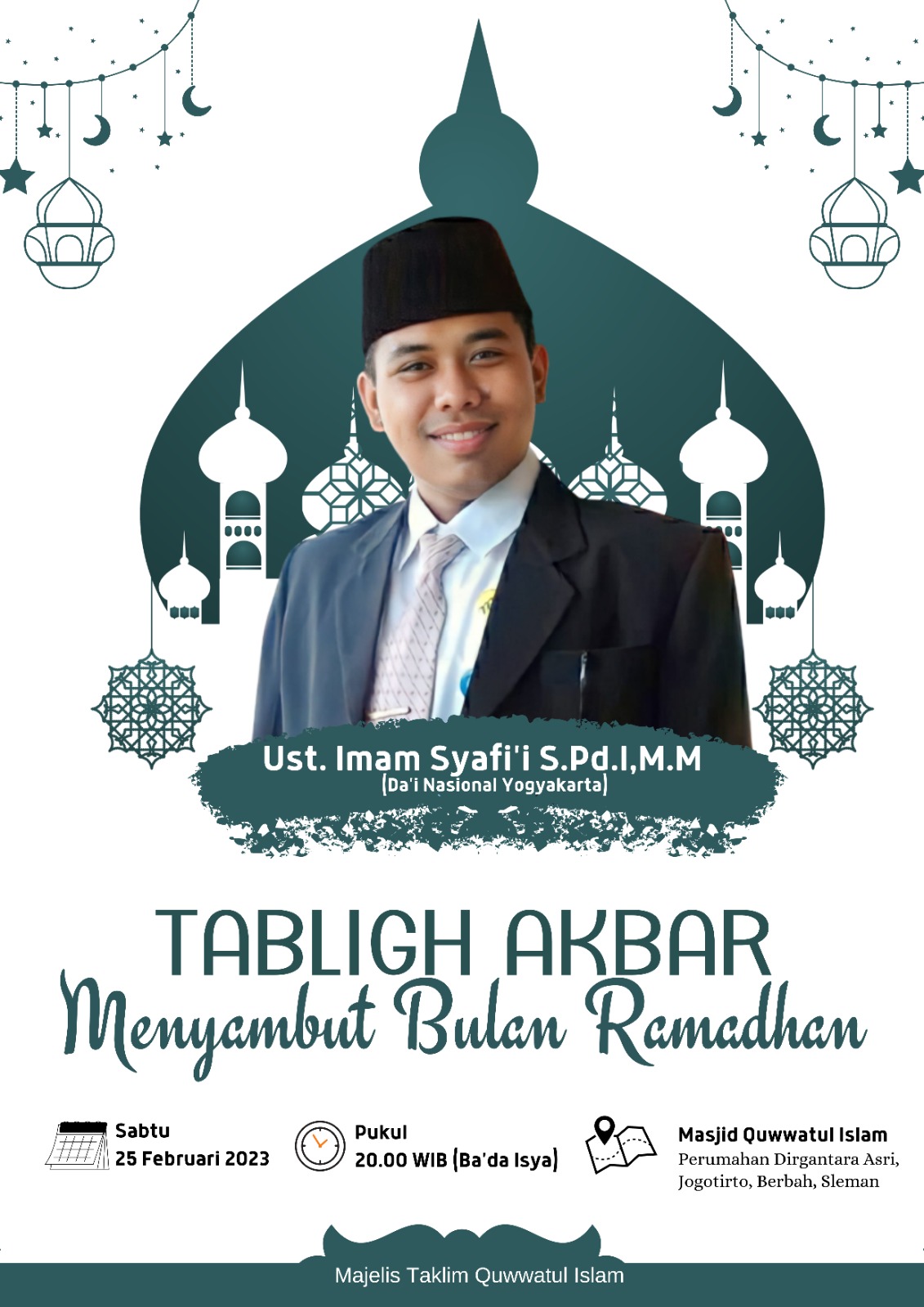 Dalam rangka menyambut bulan Ramadhan 1445H, Takmir masjid Quwwatul Islam menggelar Tabligh Akbar. Kegiatan ini akan dilangsungkan Sabtu, 25 Februari 2023, selepas Isya.