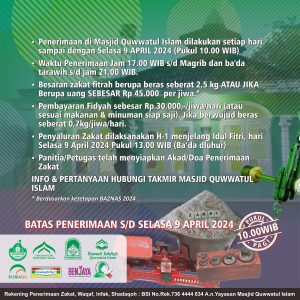 - Penerimaan di Masjid Quwwatul Islam dilakukan setiap hari sampai dengan Selasa 9 APRIL 2024 (Pukul 10.00 WIB)