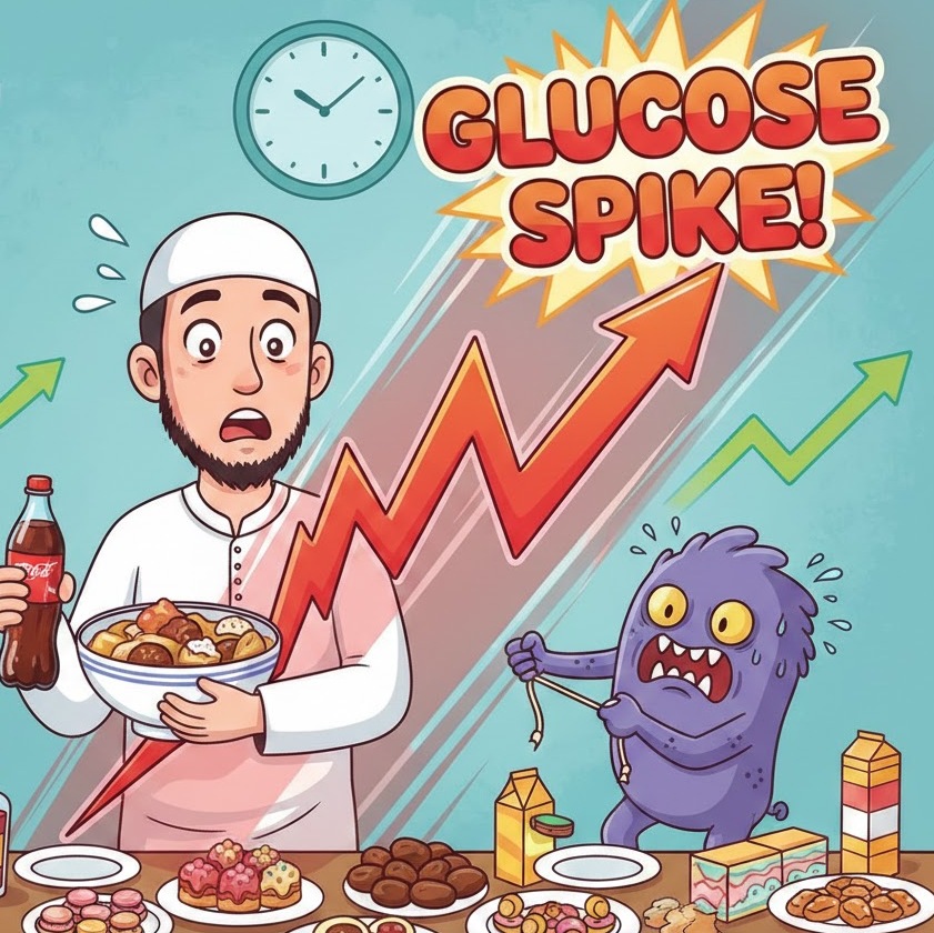 Glucose spike bukan karena ibadah puasanya, tetapi karena cara berbuka puasa yang salah. Puasa bukan hanya soal menahan makan, tetapi tentang mengatur respons tubuh. Jika berbuka puasa dilakukan dengan bijak, maka ;